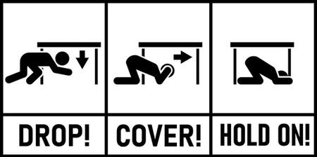 COVER your head and neck, preferably your entire body, under a sturdy table or desk. If there's no shelter nearby, get out near the inner wall or next to low furniture that won't fall, and cover your head and neck with your arms and hands.